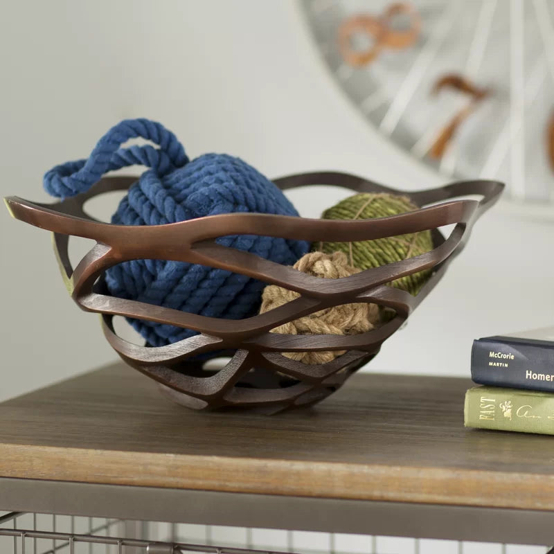 Brimming with visual intrigue, this decorative bowl fuses function with modern style. This bowl is crafted from aluminum in India, and showcases a curved silhouette and open geometric details for a distinctive and breezy look. A solid copper finish outfits this bowl's color palette, while this design is measured at 16" wide and 7" tall. Perfect for catching keys, wallets, and other accessories in the entryway, or used simply as decor on the dining room table.